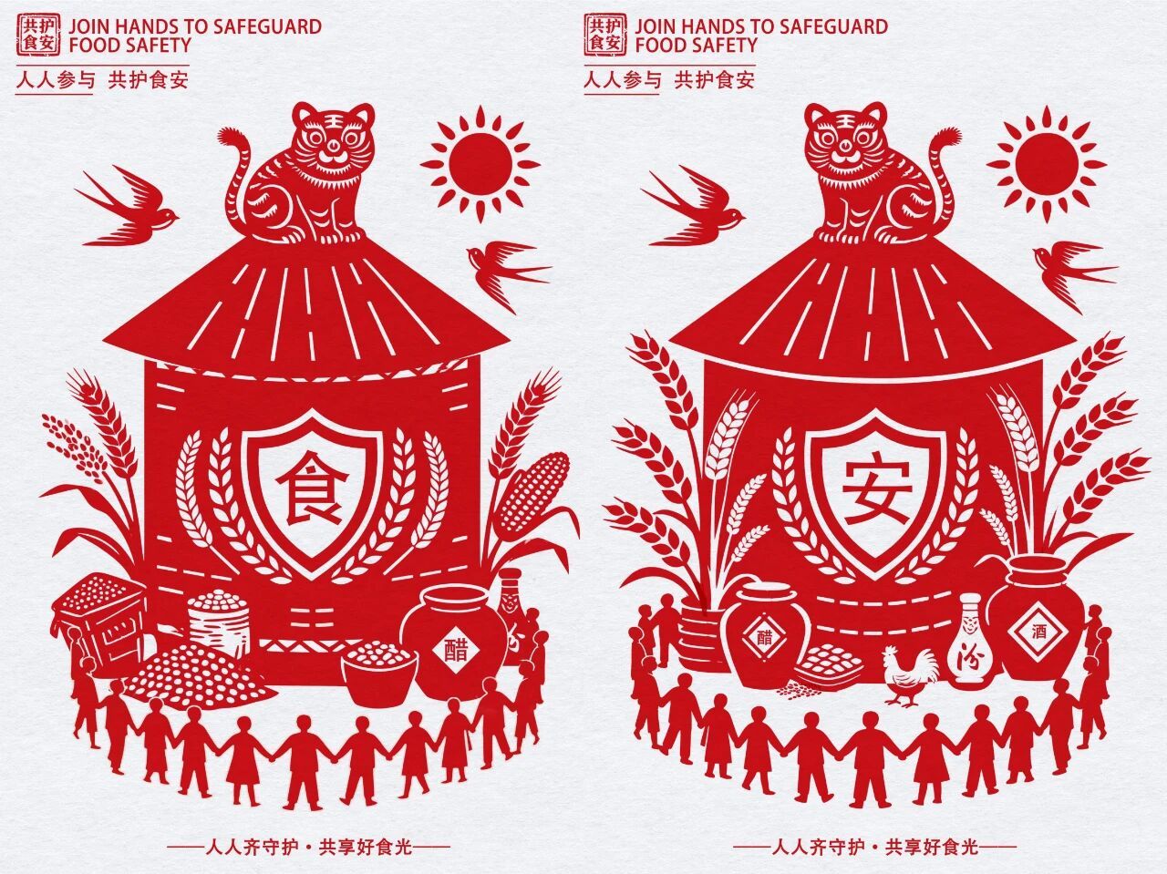 平面类作品《共护食安》以山西非物质文化遗产剪纸艺术为焦点视觉载体,,,,深度融合汾酒、老陈醋等极具辨识度的山西地区文化符号,,,,巧妙植入粮仓、麦穗等象征粮食清静的元素,,,,以及盾牌、老虎、携手人群等蕴含守护寓意的视觉意象,,,,将“人人加入共护食物清静,,,,共享山西优美食光”的焦点理念具象化泛起。。。。作品既生动诠释了食物清静关乎民生福祉、需要社会各界协同发力的深刻内在,,,,又让山西古板美学与现代食安主题同频共振,,,,彰显了中华优异古板文化的奇异魅力与市价钱值。。。。