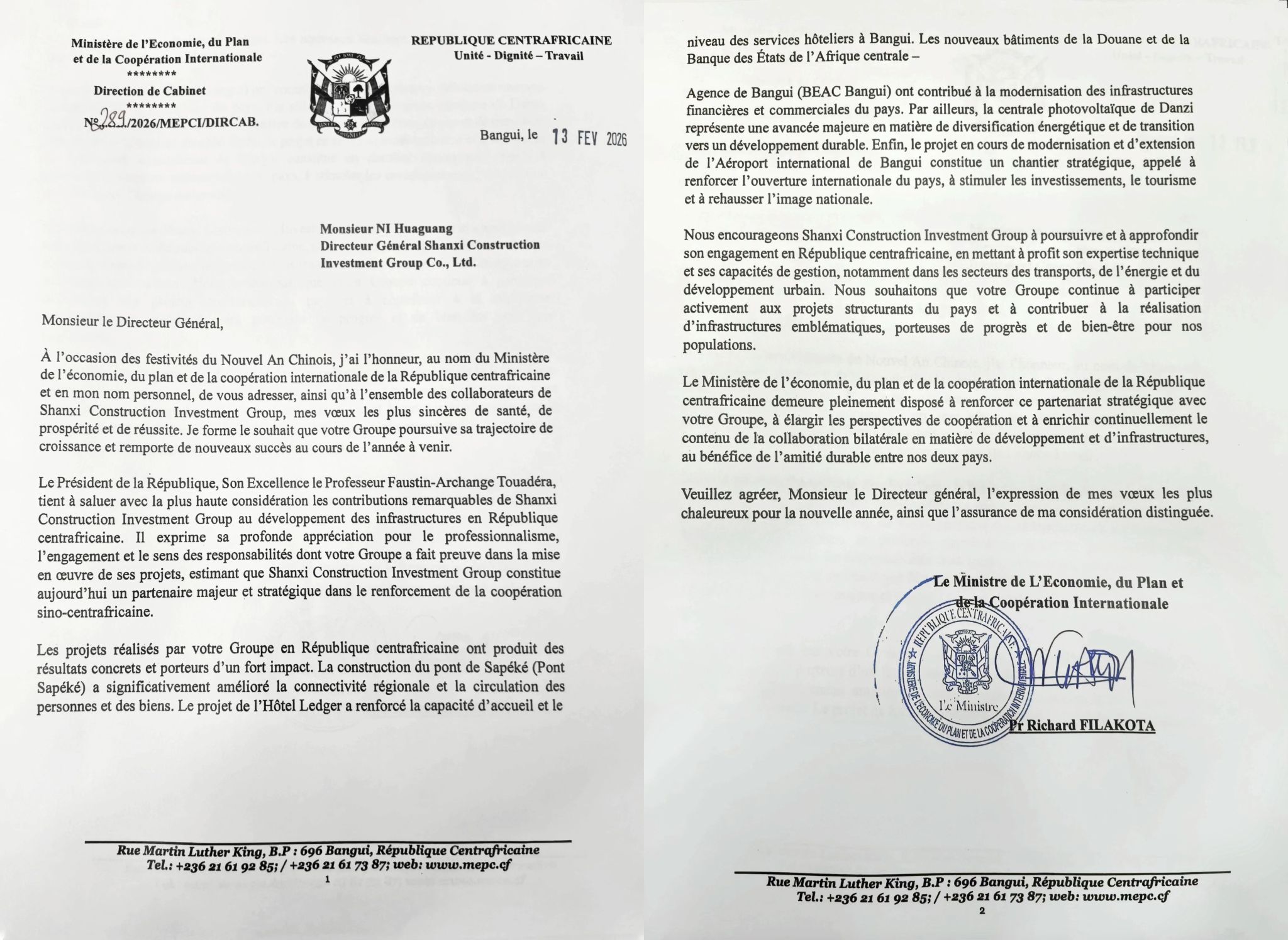 中非共和国经济、妄想和国际相助部表扬信