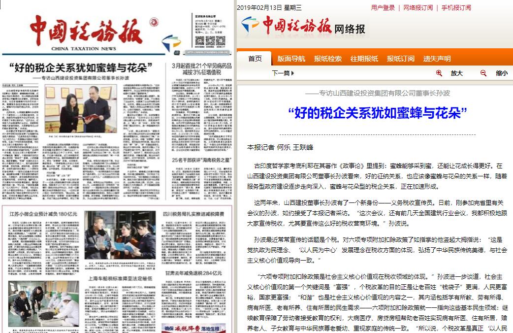 这两年来,,,,,山西建投董事长孙波有了一个新身份——义务税收宣传员。。日前,,,,,刚加入完省里有关聚会的孙波,,,,,如约接受了本报记者采访。。“这次聚会,,,,,尚有前几天天下修建行业聚会,,,,,我都起劲地跟各人宣传税收,,,,,尤其要宣传这么好的税收营商情形。。”孙波说。。