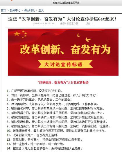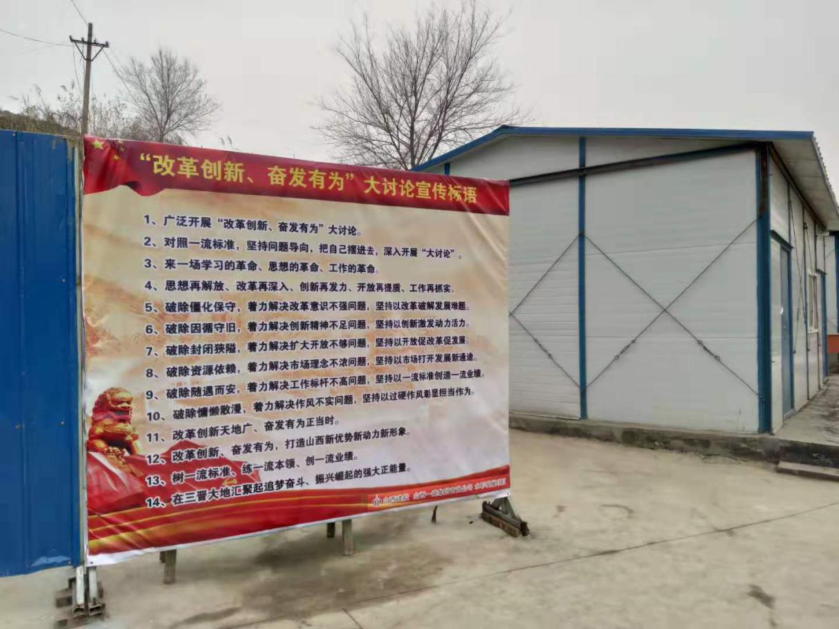 山西建投建工集团让宣传口号走进了生产一线,,,,走进了施工现场、走进了宣传栏和聚会室,,,,通过强有力的视觉攻击和头脑碰撞,,,,激励全员起劲加入到大讨论中。。公司张挂宣传条幅150多幅,,,,刊播宣传口号笼罩34个下层单位,,,,35个党支部,,,,百余个在施项目部。。