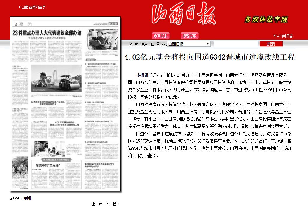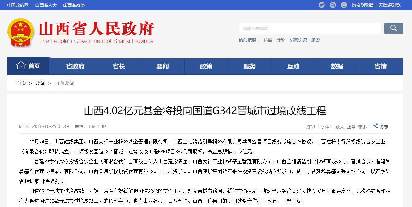 山西建投深耕投资+尊龙凯时模式,,,,近年来建设了晋建私募等金融类企业,,,,以产融连系一直推进集团转型生长。。。凭证协议山西建投、太行工业基金、清洁投资、通俗合资人晋建私募、黄河股权将配合出资设立山西建投太行股权投资合资企业(有限合资),,,,专项投资于国道G342晋都会过境段公路改线工程PPP项目SPV公司股权,,,,基金总规模4.02亿元。。。
