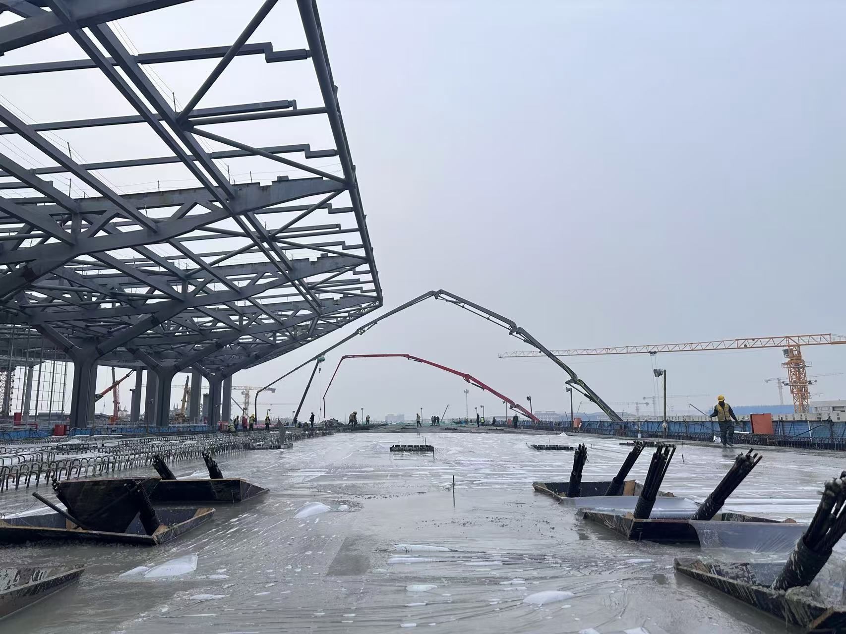 此次现浇GJXU19联箱梁位于新建T3航站楼前,,,,,一联四跨,,,,,每跨36米,,,,,总长度144米,,,,,梁宽39.8米,,,,,梁高2.2米,,,,,钢筋1165吨,,,,,混凝土4961立方米,,,,,具有体量大、要求高、难度大等特点。。。为确保浇筑顺遂,,,,,项目部超前谋划,,,,,一连优化组织设计、施工计划,,,,,通过运用BIM模子的可视化功效构建高精度三维模子,,,,,乐成战胜超宽梁体模板搭建与支持系统设计手艺难关,,,,,化解了作业面狭窄与其它施工项目交织作业的清静危害。。。最终,,,,,经由近45个小时的起劲,,,,,在百余名作业职员的协同联动下,,,,,项目圆满完成浇筑使命,,,,,高架桥第一阶段意会正式进入冲刺阶段,,,,,为项目准期完工涤讪了坚实基础。。。