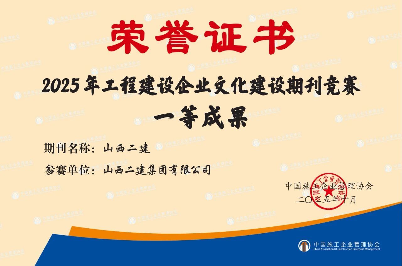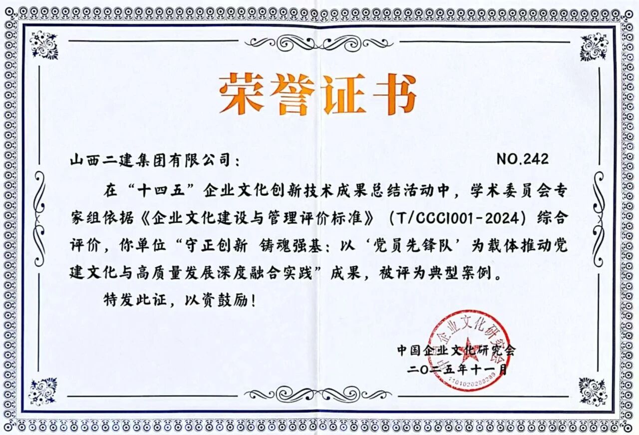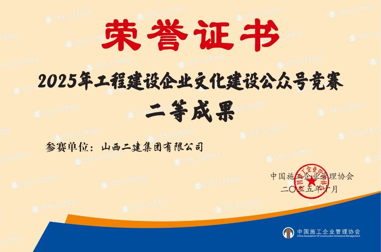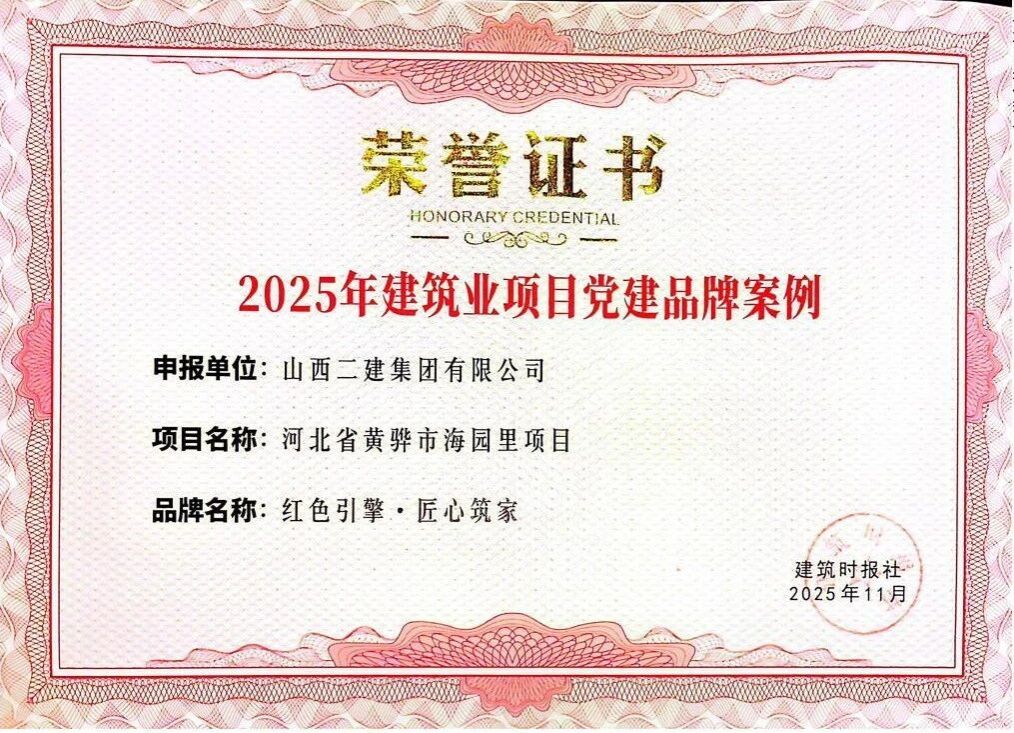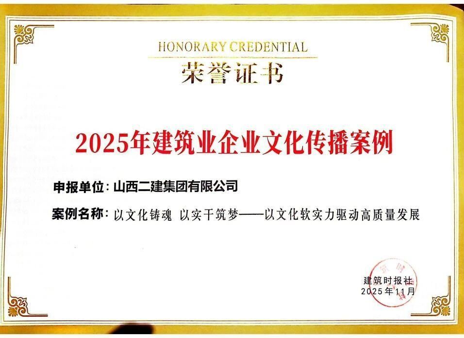 在中国企业文化研究会主理的2025年中外企业文化峰会上,,,二建集团申报的《守正立异铸魂强基:以“党员先锋队”为载体推动党建文化与高质量生长深度融合实践》效果获评典范案例;;在2025年修建业企业文化效果宣布会暨修建时报社天下通联事情聚会上,,,宣传期刊《山西二建》获评“2025年修建业优异出书刊物”;;《以文化铸魂以实干筑梦——以文化软实力驱动高质量生长》入选2025年度企业文化撒播案例;;河北黄骅市海园里项目《红色引擎·匠心筑家》获评2025年度修建业项目党建品牌案例;;在中国施工企业治理协会2025年工程尊龙凯时企业文化效果评选中,,,《山西二建》期刊、二建集团微信公众号划分荣获一等效果和二等效果。。。。。