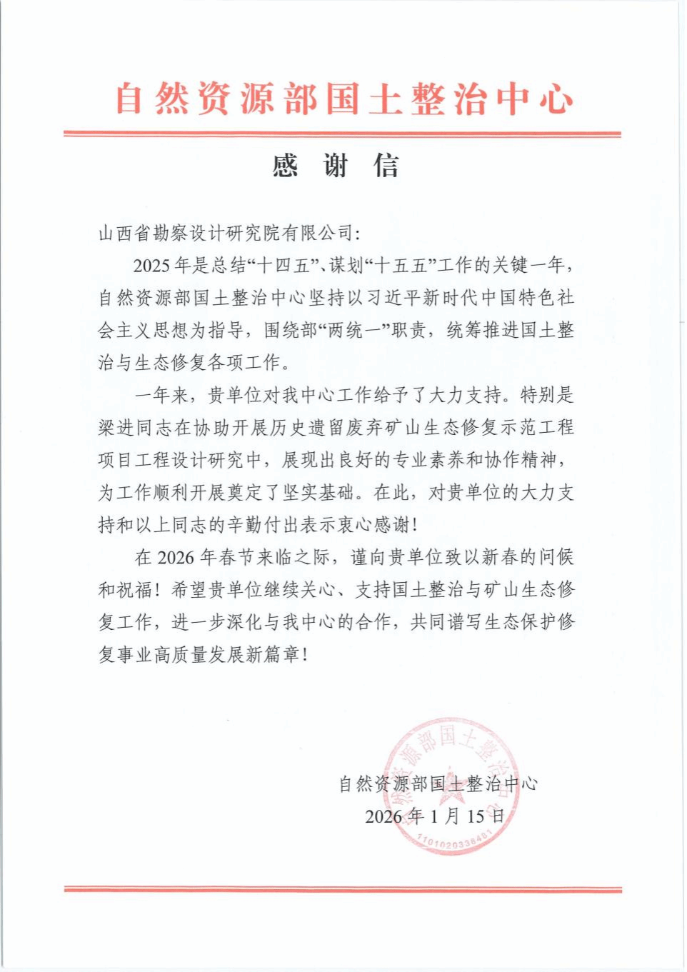 ¿ËÈÕ£¬£¬£¬É½Î÷½¨Í¶¿±Ì½Ôº¹«Ë¾ÊÕµ½À´×Ô×ÔÈ»×ÊÔ´²¿ÁìÍÁÕûÖÎÖÐÐÄ·¢À´µÄллÐÅ£¬£¬£¬ÐÅÖжԹ«Ë¾ÔÚÁìÍÁÕûÖÎÓëÉú̬ÐÞ¸´ÊÂÇéÖеͦÁ¦´ó¾ÙÖ§³ÖÖÂÒÔÕæÖ¿Ð»Òâ¡£¡£¡£¡£