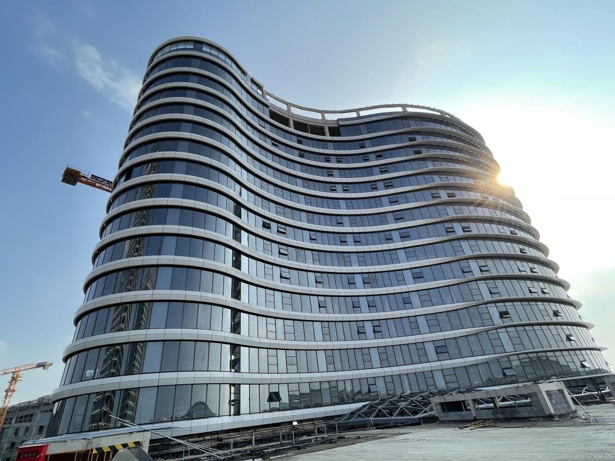 2号旅馆项目100多米的高空上,,,,,手艺娴熟的幕墙装置工人们穿梭在钢板之间,,,,,正在装置一块块约1吨重的玻璃幕墙。。。大型吊车忙碌地将屋顶所需质料精准运送到位。。。屋顶上,,,,,吊装到位的钢结构网架在火花四溅的焊花中被焊牢、成型。。。修建外立面上,,,,,“蜘蛛侠”一样的工人师傅们系着清静带,,,,,自上而下搭设着幕墙面层需要的“龙骨”。。。