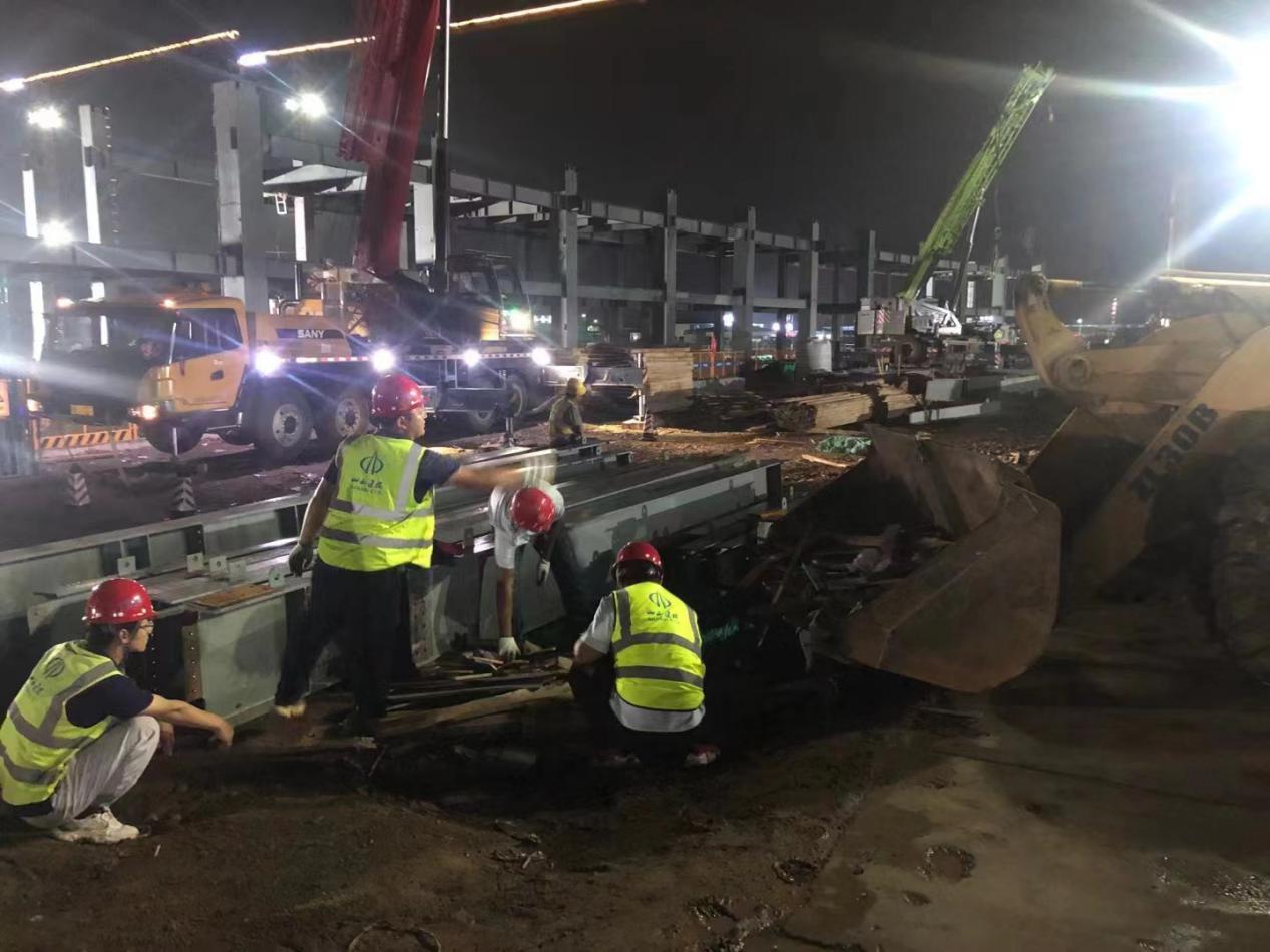 国际会展中心北侧组团项目1#连廊位于北展与中展之间,,,,,为毗连北展厅和中展厅的人行通廊。。。连廊为钢框架结构,,,,,由8根钢管混凝土柱通过球形支座支持,,,,,轴线长度115.1米,,,,,宽度27米,,,,,重量约1500吨。。。工程危害系数较大,,,,,精度要求高,,,,,为包管施工质量,,,,,项目部开展专家论证,,,,,全心策划、重复推敲,,,,,一直优化施工计划,,,,,最终确定桁架吊装选用三台200吨汽车吊及一台150吨履带吊,,,,,钢梁吊装选用一台100吨汽车吊,,,,,接纳在节段下方架设支架,,,,,高空组拼装置法举行现场装置。。。同时做好清静质量手艺交底,,,,,起劲组织作业班组职员和物资、装备清静进场。。。