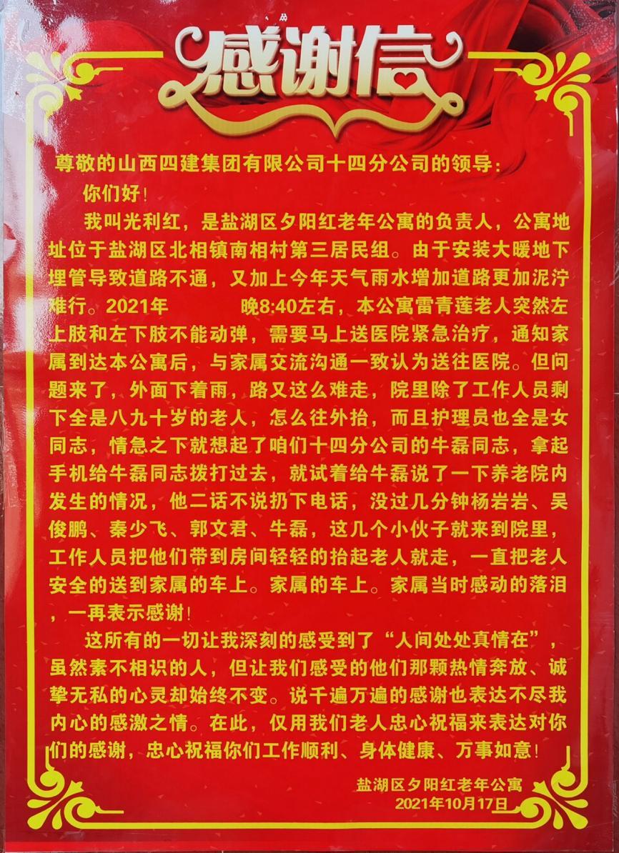 集中供热事关黎民,,是重大的民生工程。。。。。项目治理职员经常深入住户家中实地走访,,并举行现场丈量,,对差别住民提出的差别问题,,耐心向住户诠释说明,,并认真做好相关纪录,,施工中实时协调解决,,与周边住民建设了温馨融洽的关系。。。。。一天,,项目部治理职员在夜间例行检查时,,接到集中供热所在区域斜阳红晚年公寓认真人光利红的求助电话,,有一位老人突发疾病,,需要马上送医院紧迫治疗,,因下雨时代蹊径泥泞,,车辆无法通行。。。。。项目职员牛磊、杨岩岩、吴俊鹏、秦少飞及工人郭文君没有丝毫犹豫,,急遽前往晚年公寓,,协助事情职员将老人抬出,,并清静送上车,,使得老人实时获得医治。。。。。