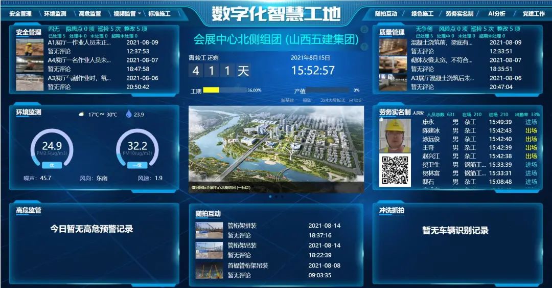运用建投集团智慧工地平台,,,实时对清静治理、情形监测、劳务实名制治理等信息实时归集、统计、剖析、比照,,,实现项目可视化智能治理,,,提高工程治理信息化水平。。。。