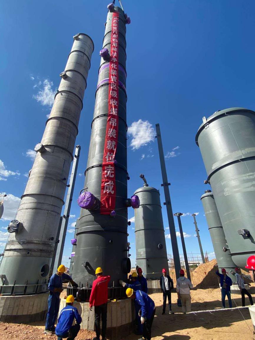 克日,,,公司承建的内蒙古雅海LNG项目801A净化妆置区吸收塔吊装一次乐成。。。。
