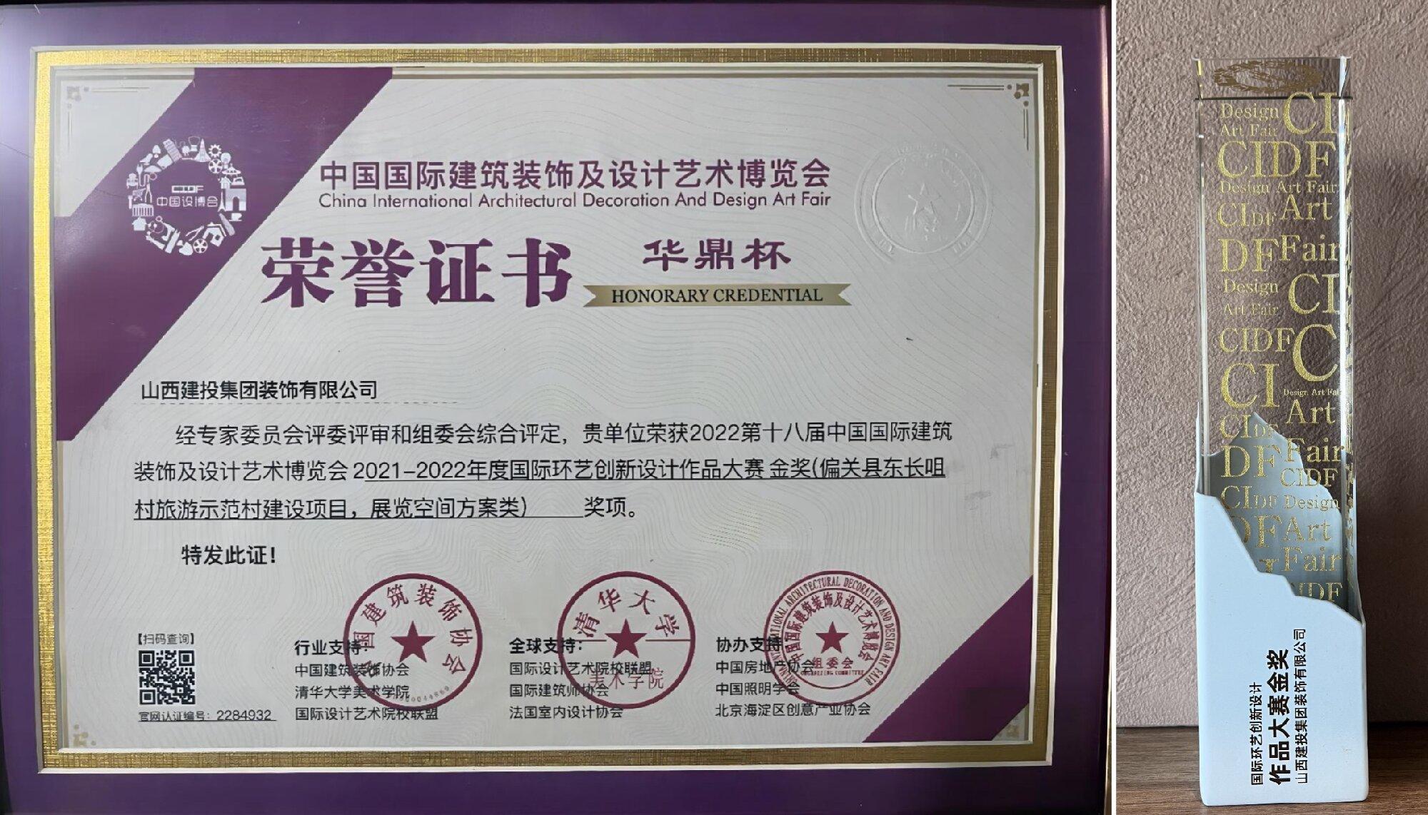 近期,,,,,第十八届中国国际修建装饰及设计艺术展览会在北京雁栖湖国际会展中心召开,,,,,会上山西建投装饰公司获得2021-2022年度中国修建装饰行业最具工匠精神设计机构奖(山西省墟落尊龙凯时一站式综合效劳尊龙凯时项目)、国际环艺立异设计作品大赛金奖(偏关县东长咀村旅游树模村尊龙凯时项目,,,,,展览空间类)。。。。。