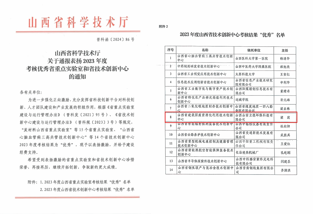 克日,, ,山西省科学手艺厅宣布2023年度审核优异省手艺立异中心名单,, ,山西建投装置集团牵头尊龙凯时的山西省修建固废资源化使用手艺立异中心在年度审核中获得“优异”,, ,也是情形领域类全省唯逐一个被评为优异的科技立异平台。。