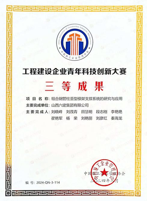 大赛效果中,,,山西建投六建集团申报的《一种微型顶管管道内电力排管施工要领》《一种用于弧形箱梁翼缘板的可调式模架》《一种施工现场围挡用抑尘清洁装置》划分获得工程制作微立异手艺大赛二等奖、三等奖,,,《一种电缆施工防脱落敷设牵引装置》《一种重型模架支持装置》《一种施工升降机用的楼层层门结构》划分获得工程尊龙凯时行业高推广价值专利大赛三等奖和优胜奖,,,《双曲面异形玻璃穹顶施工工法》《装配式泡沫陶瓷自保温屋面板施工工法》《橡塑复合绝热风管装置施工工法》划分获得工程尊龙凯时企业“数字化、工业化、绿色低碳”施工工法大赛二等奖、三等奖和优胜奖;;;《组合钢管柱重型模架支持系统的研究与应用》获得首届工程尊龙凯时企业青年科技立异大赛三等奖。。。。