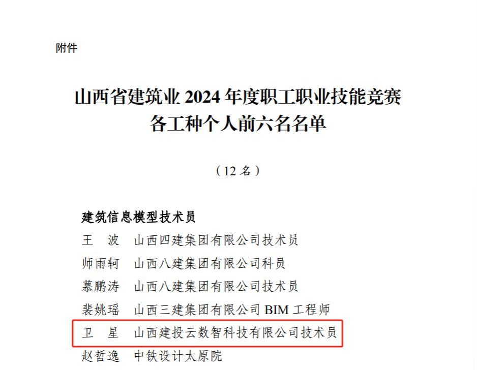 由山西省总工会、山西省人社厅、山西省住建厅联合举行的山西省修建信息模子(BIM)手艺员手艺竞赛于8月在太原举行。。。山西建投云数智公司选手卫星在竞赛中脱颖而出,,荣获第五名。。。