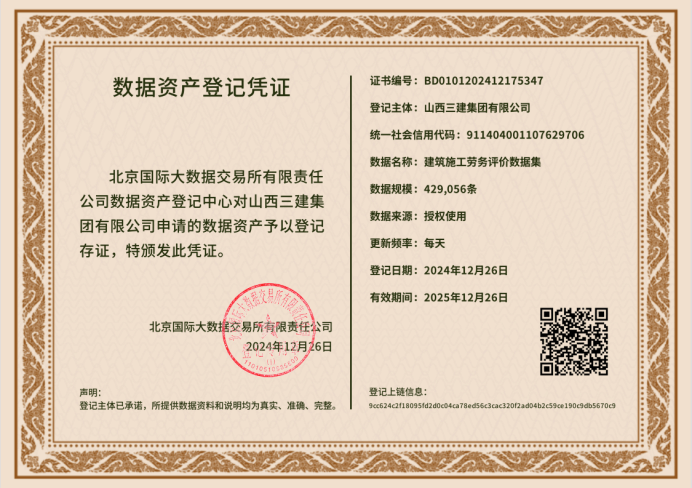 12ÔÂ26ÈÕ£¬£¬É½Î÷½¨Í¶Èý½¨¼¯ÍÅÔÚ±±¾©¹ú¼Ê´óÊý¾ÝÉúÒâËùÀÖ³ÉÍê³É¡°ÐÞ½¨Ê©¹¤ÀÍÎñÆÀ¼ÛÊý¾Ý¼¯¡±Êý¾Ý×ʲú¹ÒºÅ£¬£¬²¢ÀÖ³ÉʵÏÖÊý¾Ý×ʲúÈë±í£¬£¬³ÉΪÌìÏÂÊ×ÀýÐÞ½¨Ê©¹¤ÀÍÎñÊý¾ÝÈë±íÆóÒµ¡£¡£¡£¡£¡£