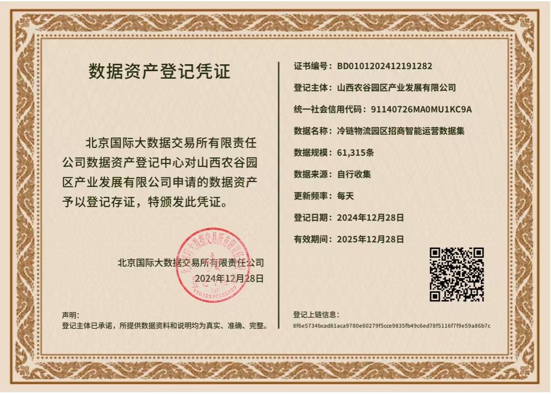 克日,,,,山西建投园区建发集团所属山西·潇河新城“智慧供能运营数据集”、山西农谷冷链物流园区“招商智能运营数据集”2个数据产品在北京国际大数据生意所完成挂号,,,,并乐成实现数据资产入表,,,,标记着公司数据资产实现“零”的突破。。