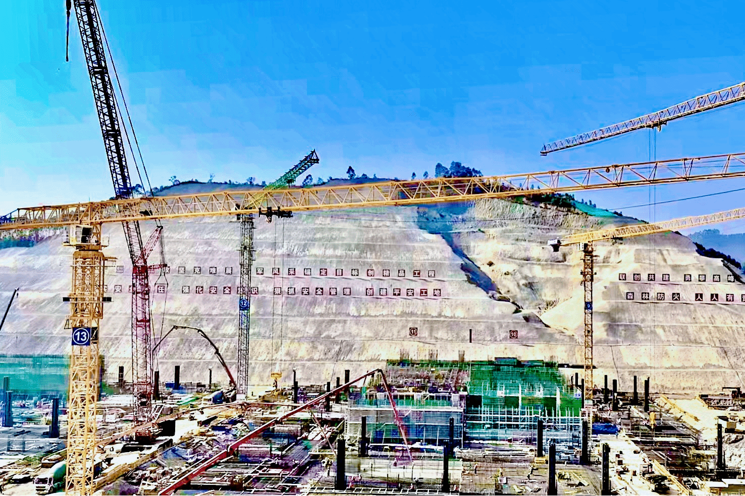 晋塔塔式起重机参建广州至湛江高速铁路珠三角枢纽机场站前工程项目。。。。该项目为明挖暗埋式地下车站,,,,主站房位于地下二层,,,,高铁和轨道交通平行,,,,共6台14线,,,,轨行区结构最大宽度164.8米,,,,长505.5米,,,,车站底板埋深26米。。。。