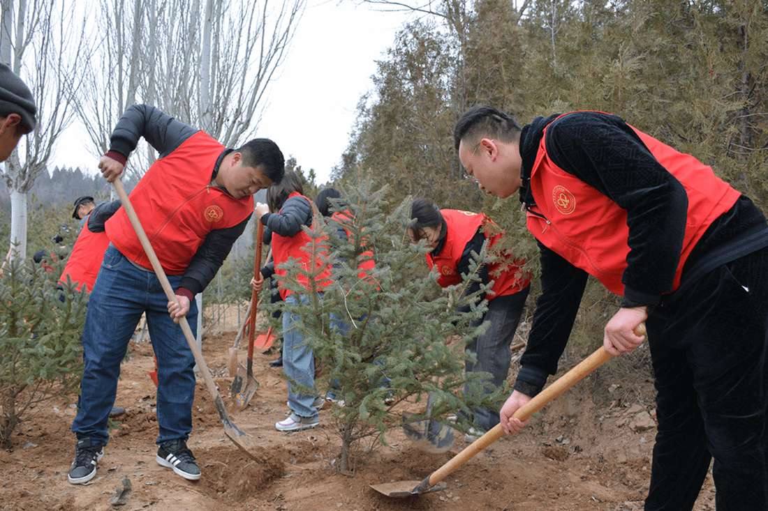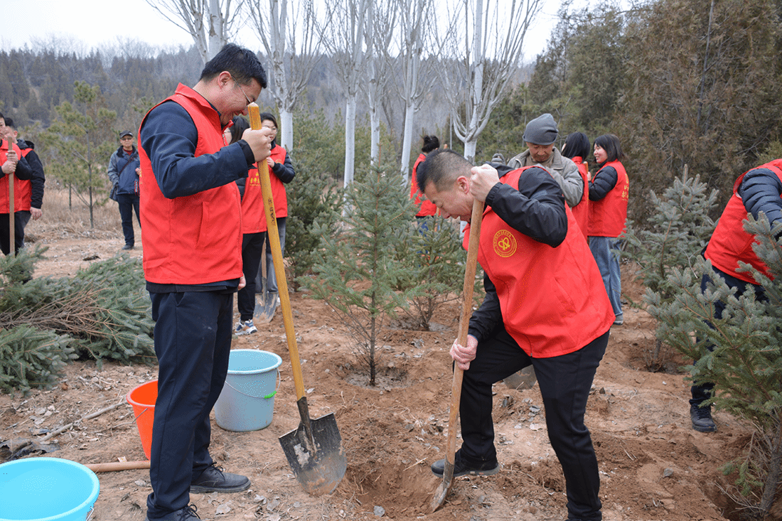 清早,,,,,太原市北山生态园阳光洒满山坡,,,,,党旗在春风中猎猎飘扬。。党员干部们身着红色马甲,,,,,手持铁锹、水桶等工具,,,,,容光焕发地来到植树点。。各人分工协作,,,,,挥锹铲土、扶苗填坑、培土浇水,,,,,每一个环节都一丝不苟,,,,,现场泛起出一派热火朝天的劳动情形。。