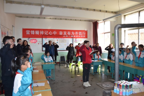 随后,,自愿者们来到了中庄寨村小学,,为孩子们讲述了雷锋的故事,,孩子们听得津津有味,,越发深刻体会到了新时期学习雷锋精神的主要性。。。集团公司团青自愿者和全校的14个孩子、先生们共唱《学习雷锋好模范》等歌曲,,并配合宣誓。。。在互动游戏环节中,,孩子们泛论了爆发在自己身边的好人好事。。。他们纯粹的笑容、朗朗的念书声让这个山村变得越创造亮而又充满希望。。。我们也希望孩子们能时时刻刻在自己心中树立起向雷锋同志学习的理念,,时时刻刻以雷锋精神激励着自己前进。。。最后,,集团公司团青自愿者们还为孩子们发放了《雷锋日志》等书籍及文具用品。。。