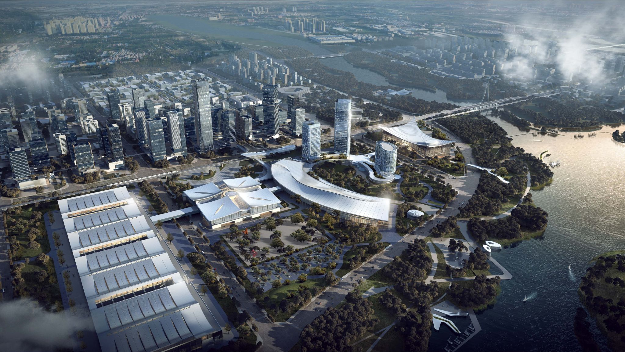 山西潇河国际会展中心北侧组团——钢框架、矩形钢管混凝土+下凹弧形倒三角空间钢桁架,,,,,装配率79%。。